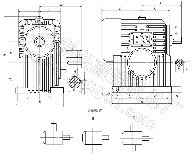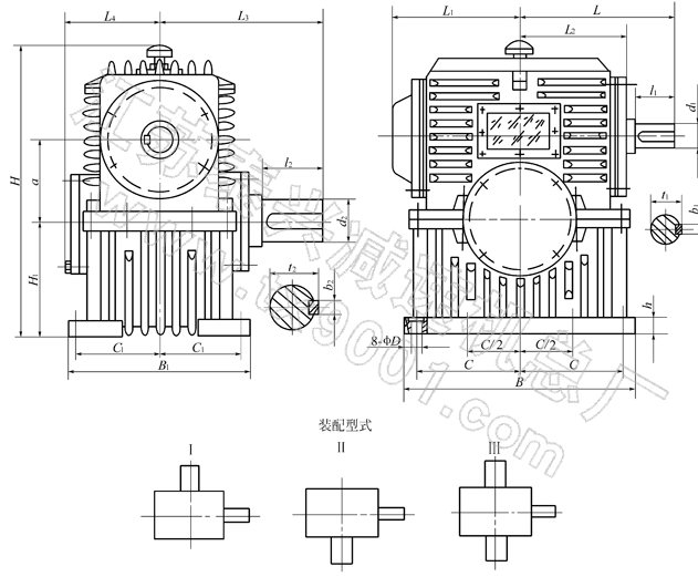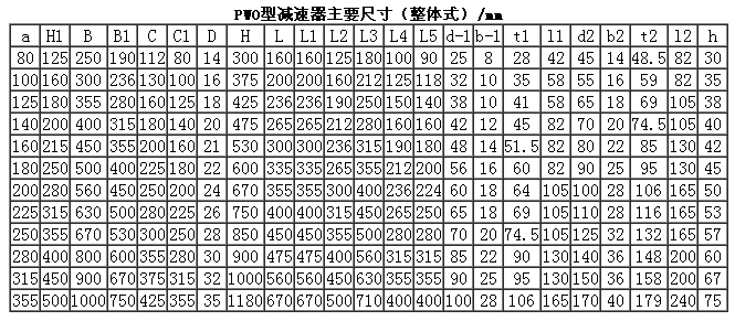 整體式PWO80、PWO100、PWO125、PWO140、PWO160、PWO180、PWO200、PWO225、PWO250、PWO280、PWO315、PWO355、型平面二次包絡環(huán)面蝸桿減速機主要尺寸(GB/T16449-1996)
